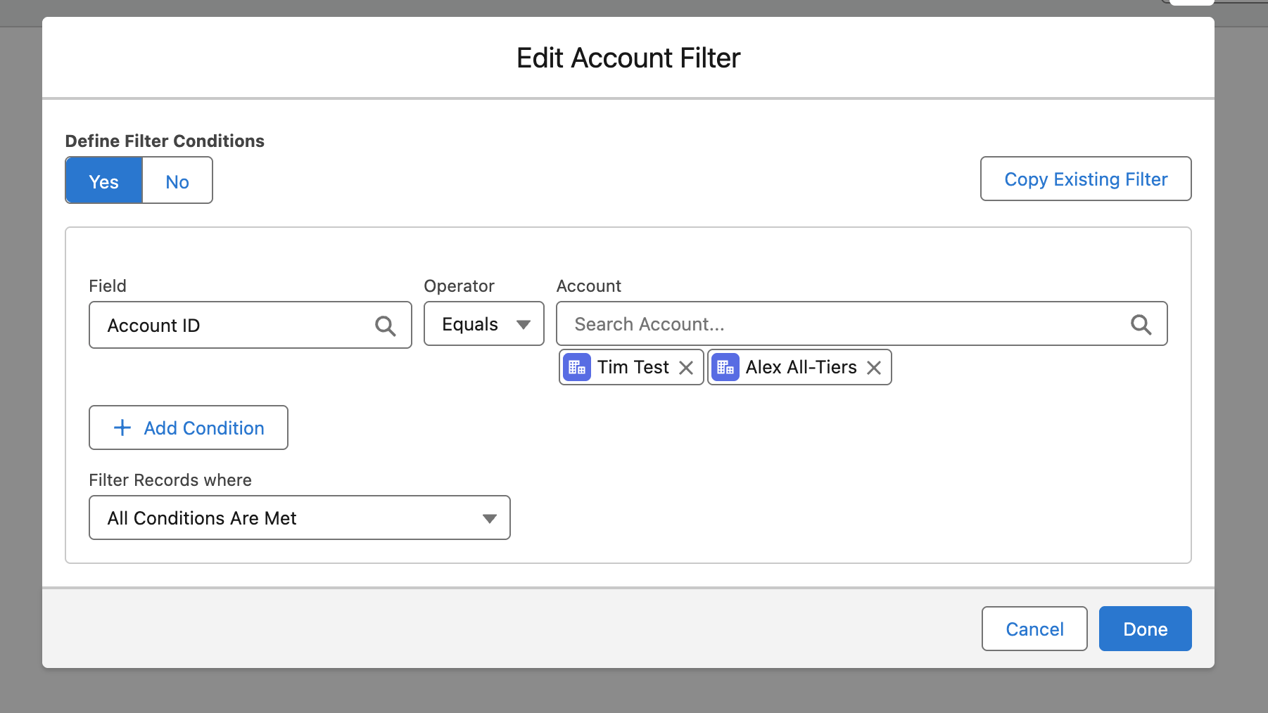 - If you wanted to select multiple records to cover a scenario like Account ID Equals Account 1 OR Account 2 OR Account 3 - you'd need to create multiple filter conditions.