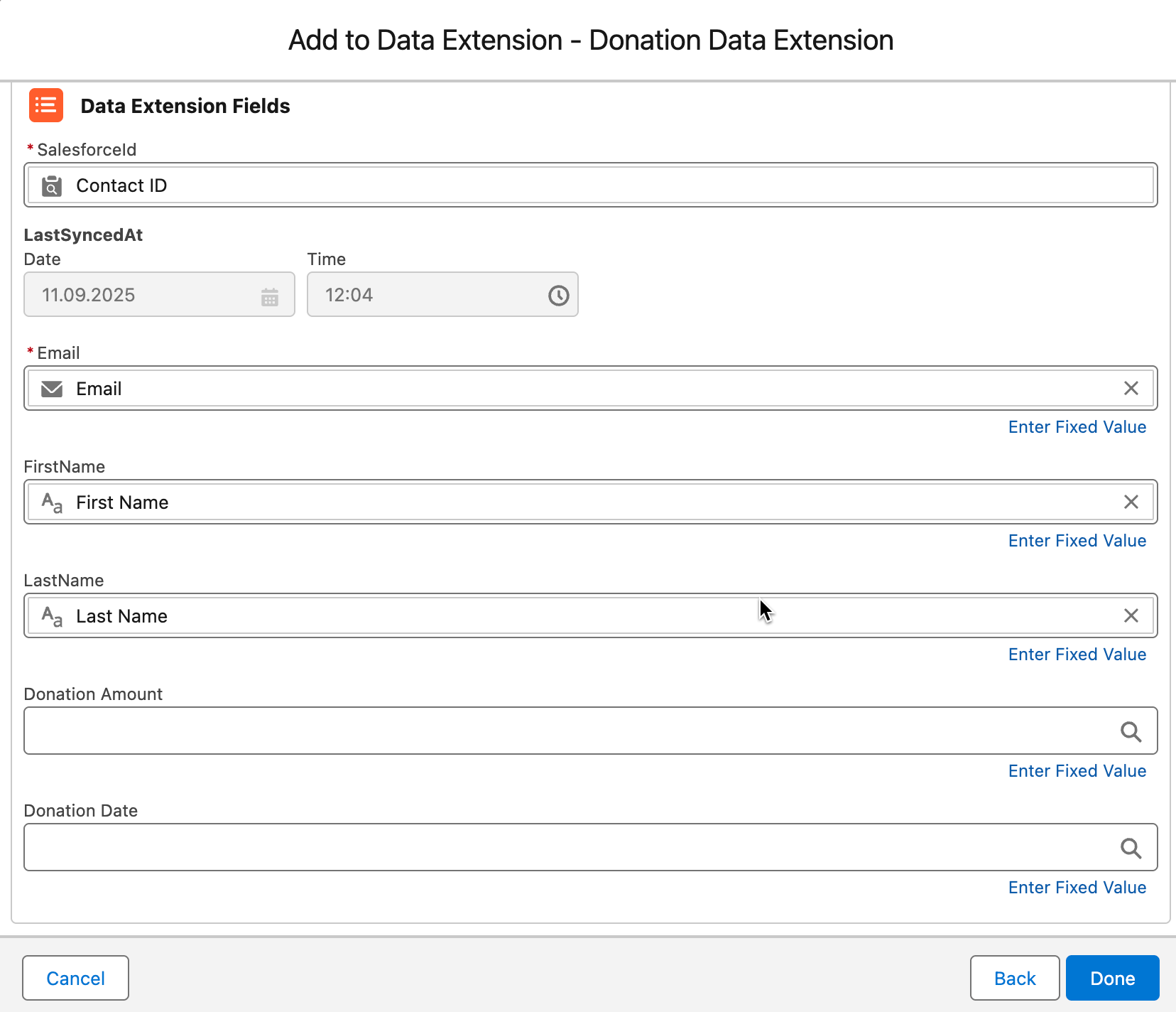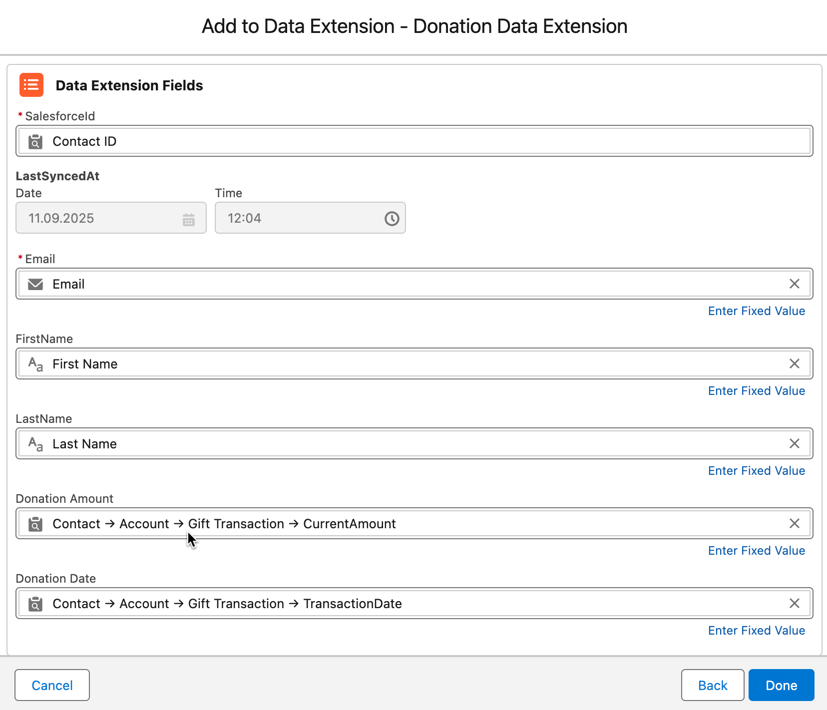 - In the final step, you select the field that should be mapped to your Data Extension Attribute.