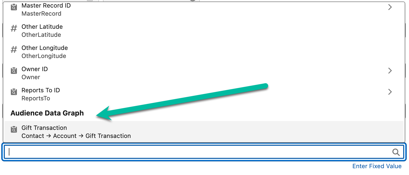 - At the bottom of the field list, you will find the Audience Data Graph section. All relevant objects used by your audience are listed.