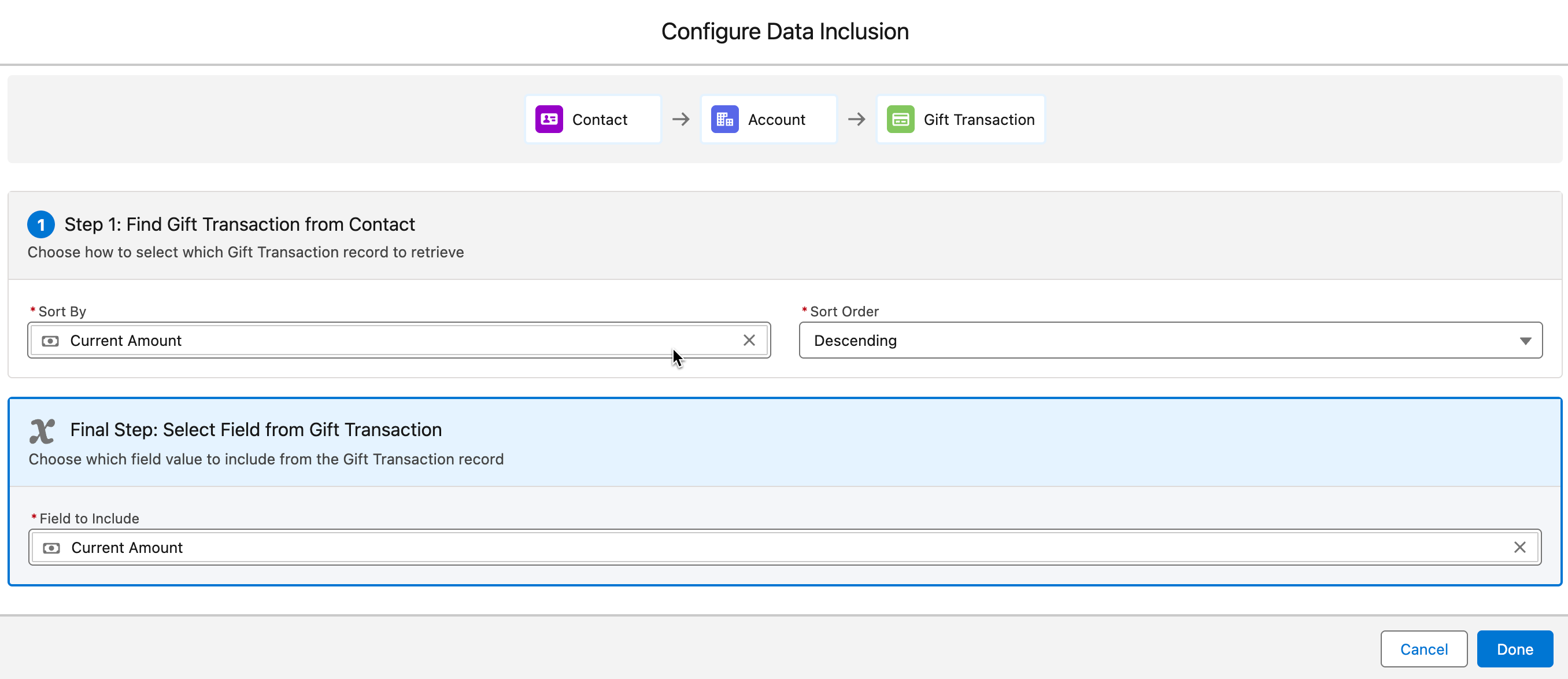 - 1 Contact - 1 Record (e.g., Opp or Donation).