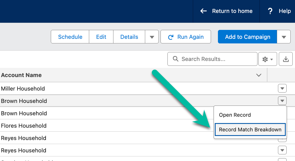 - Once you've run your audience, there's a new action button in the dropdown menu for each audience result —> Record Match Breakdown.
