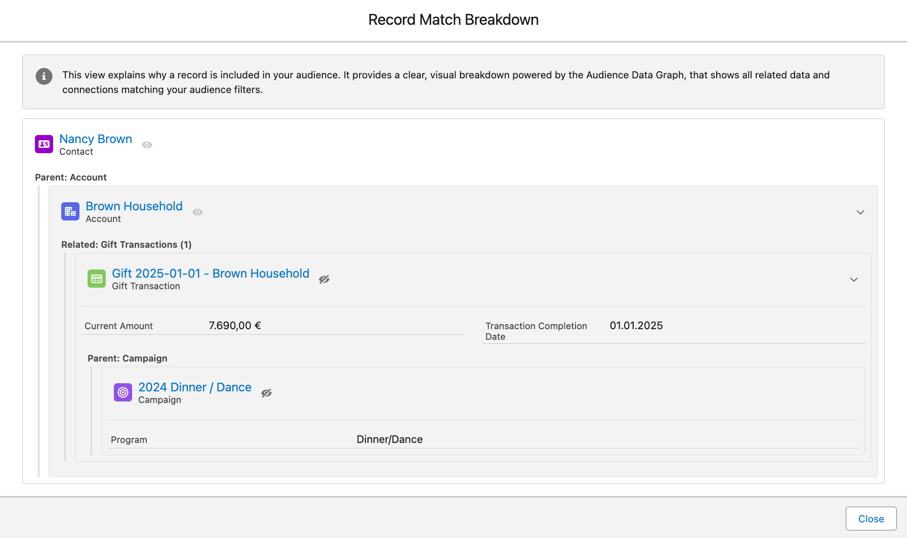 - Within the Record Match Breakdown View, we see the specific conditions and records that matched the criteria: