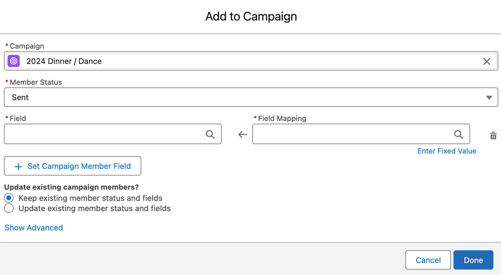- You can either enter fixed values or map record fields that then dynamically populate the campaign member fields.