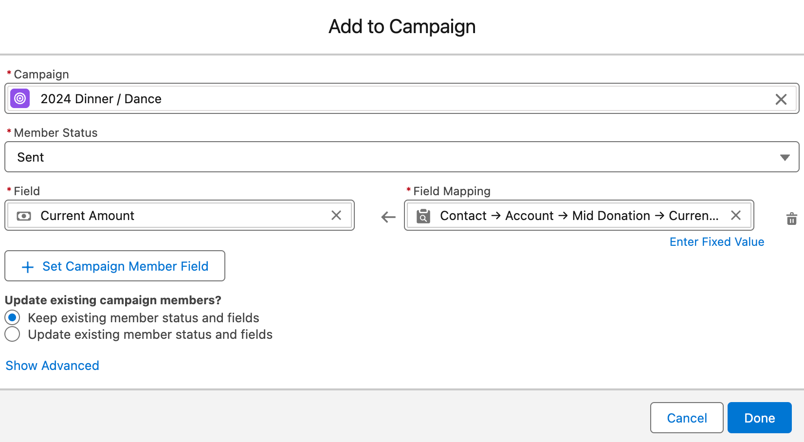 - And you can utilize the data graph feature. This allows you to map specific values of records in your audience—for example, gift transactions. Then you could map the gift transaction amount to a campaign member field.