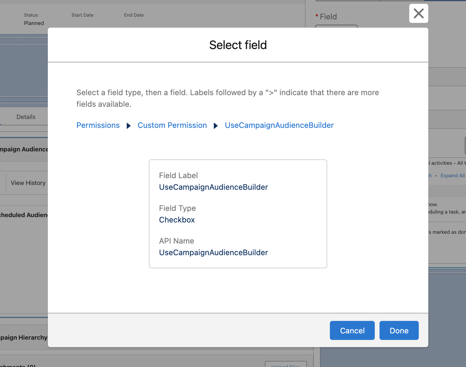 - Select Advanced > Permissions > Custom Permission > lb.UseCampaignAudienceBuilder Equals True.
