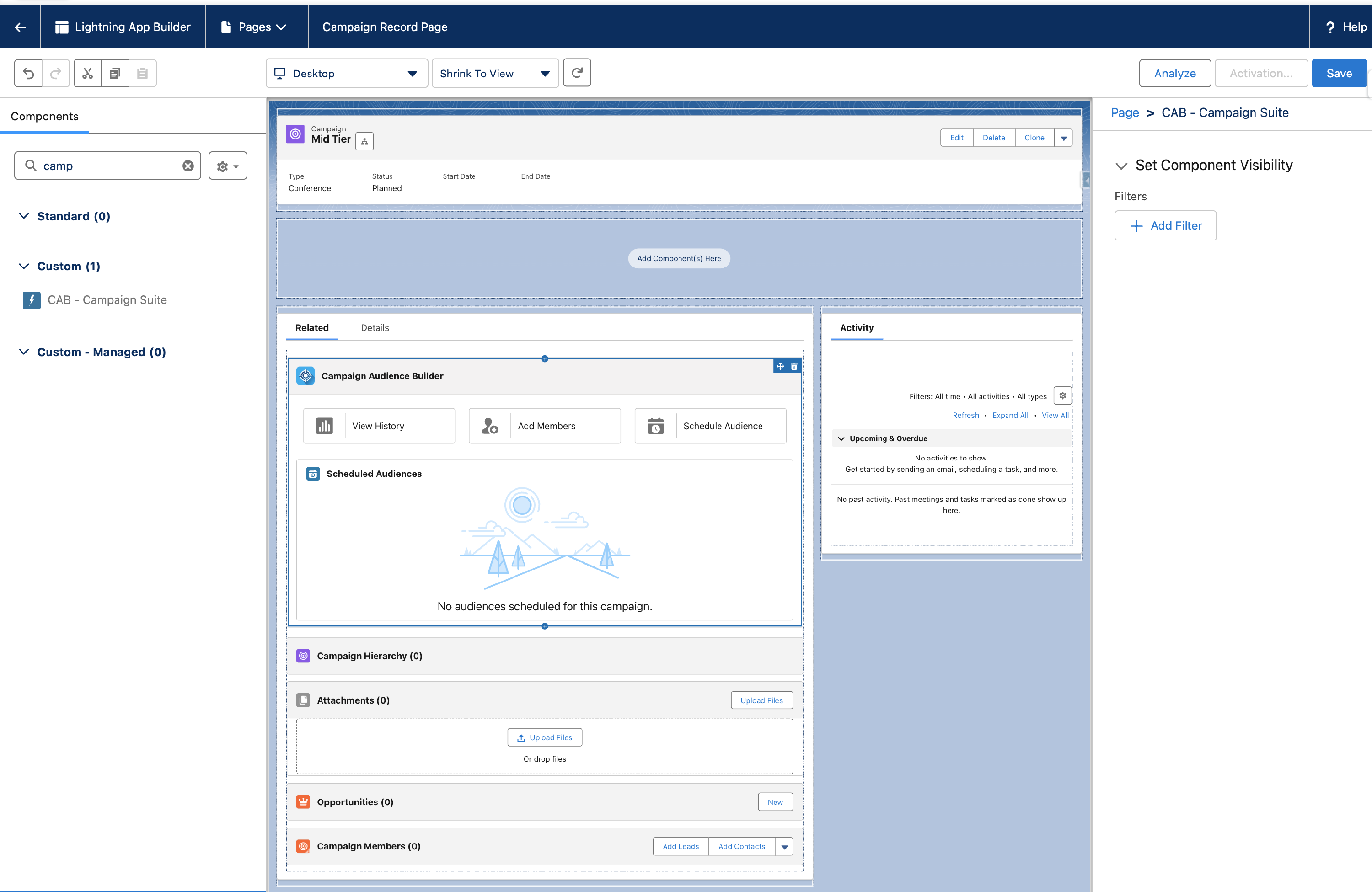 - Click Save to complete the setup. If you've never set up a campaign record page before, you also need to activate this page now.