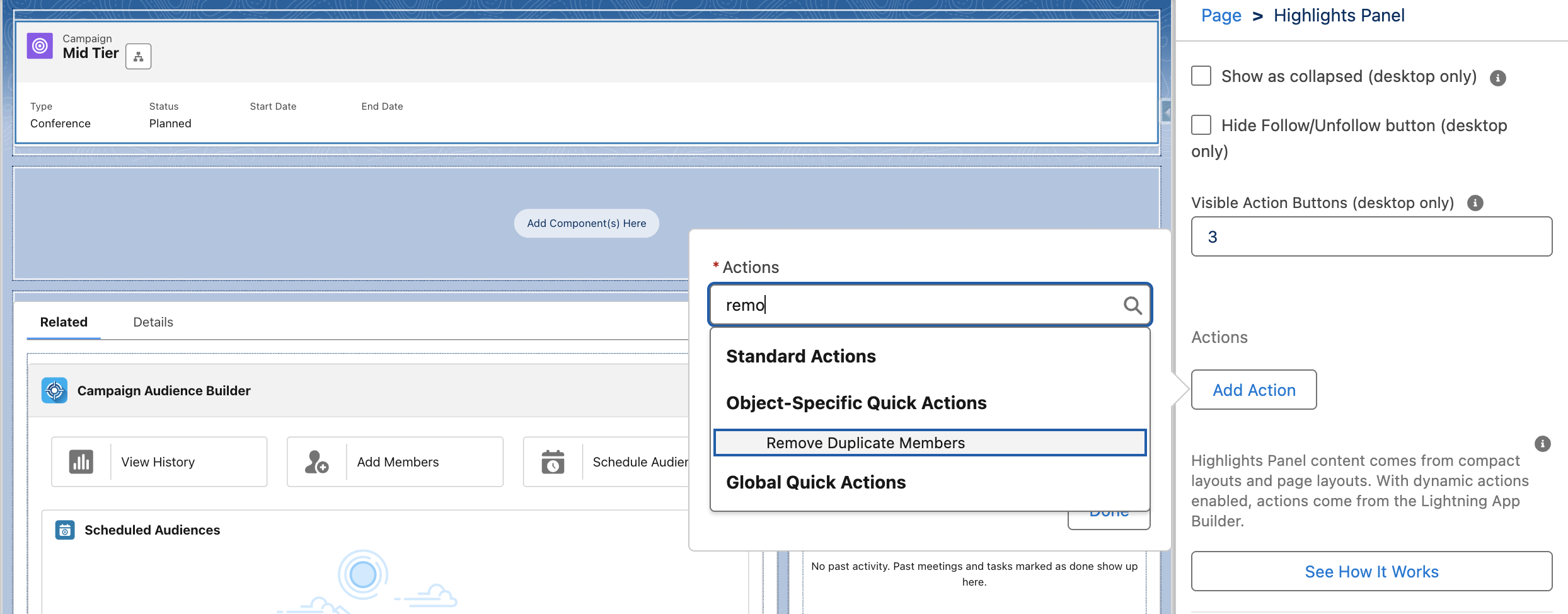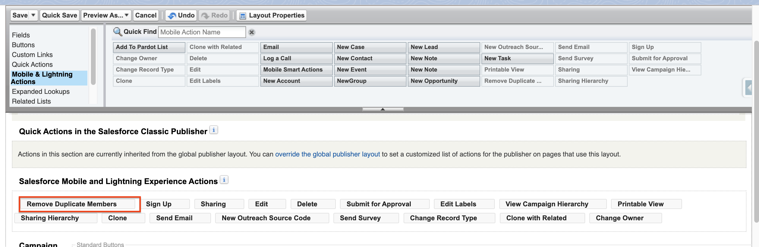 - Then select the Mobile & Lightnin Actions menu and drag and drop the Remove Duplicate Members button to your Buttons Panel.
